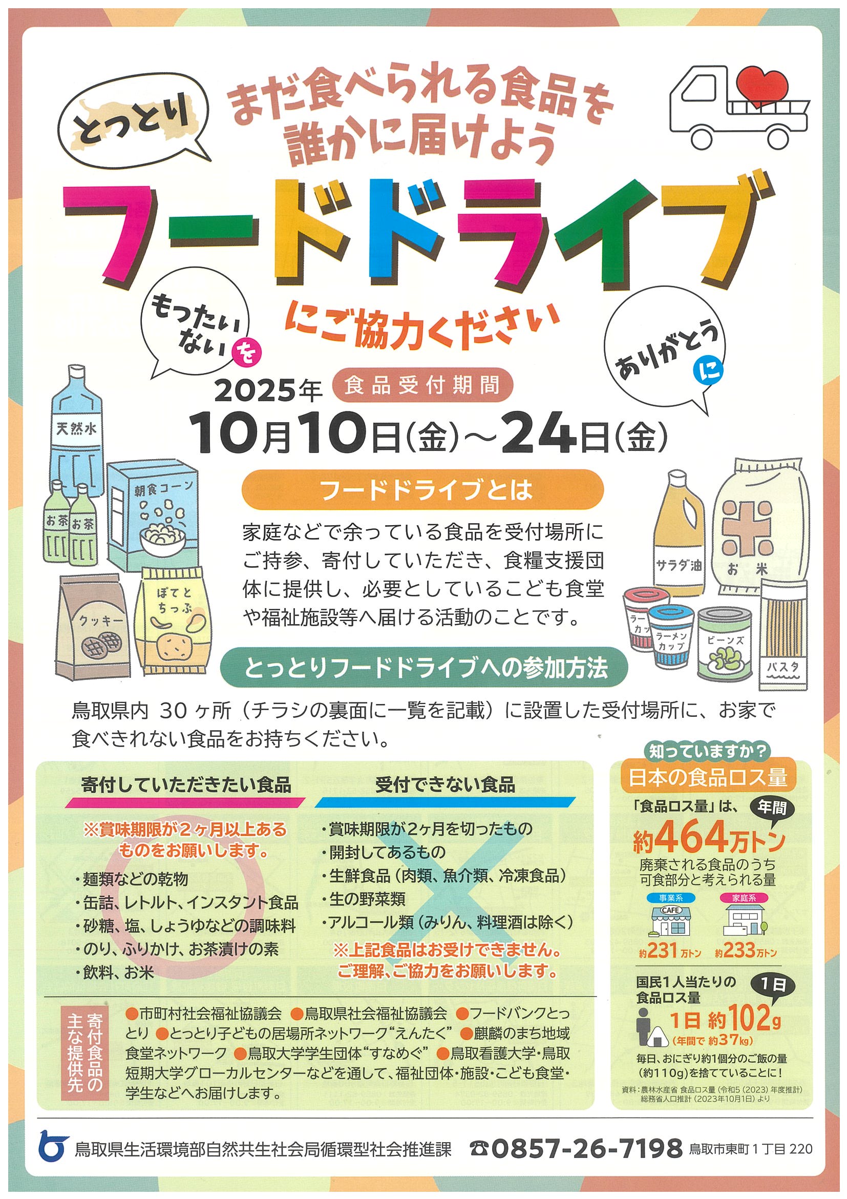 鳥取県と県内市町村が連携して行う「とっとりフードドライブ」を実施します。フードドライブとは、ご家庭で余っている食品を持ち寄り、食糧支援団体に提供し、必要としているこども食堂や福祉施設等へ届ける活動のことです。
