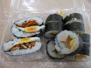 この教室では、健康福祉課の乾管理栄養士が講師となり、酢飯と具材を作り、巻きすで巻いて作る「昔ながらの巻き寿司」と、具材をのせて握らないおにぎり「おにぎらず」を作りました。