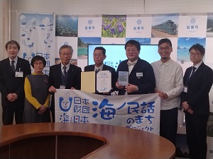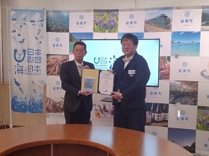 海ノ民話のまち認定式 長戸町長とアニメ監督の沼田心之介監督