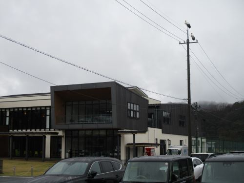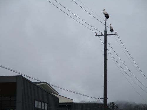 中央公民館横の電柱に、コウノトリ2羽がやってきました。